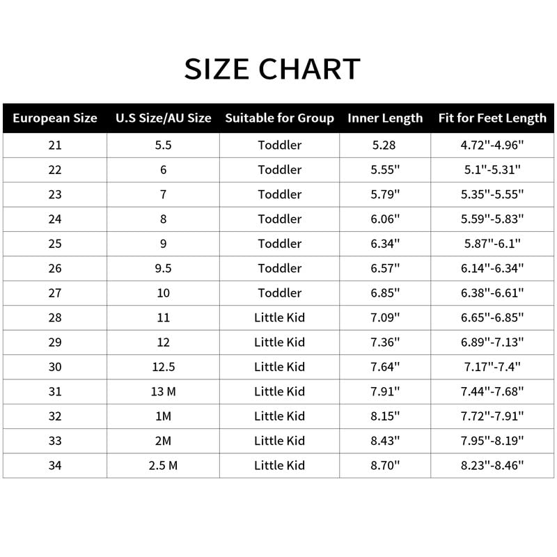 Notice for size choose— The recommended age is just for your reference,Please refer to the size chart and measure your baby’s feet before ordering this toddler shoes.