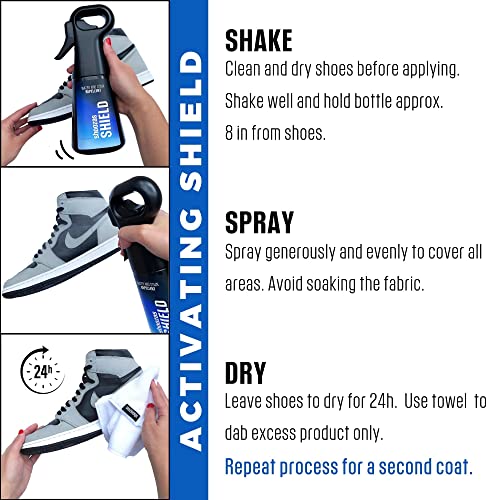 Shoozas Shield – Stain & Water Repellent Spray for shoes – creates an invisible and breathable shield to offer protection to your sneakers against liquids and stains. Wear your shoes with confidence anywhere and and prevent stains from rain, dirt, food, drinks, and just any unexpected liquid threat! Shoozas Shield is water-based, propellant free and VOC free, secure for you, your shoes, and the earth. Our unique applicator and formula are better than aerosol. Shoe spray works on most materials, use on suede, nubuck, canvas, knit, nylon, and more. Try a small area first.